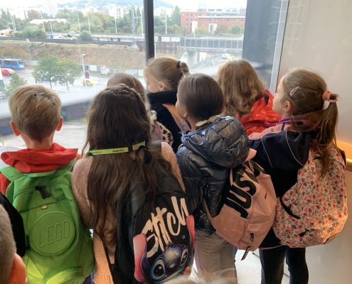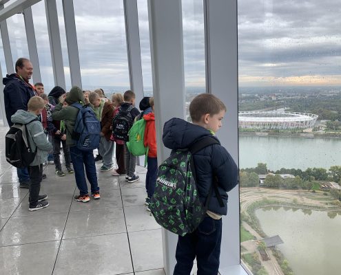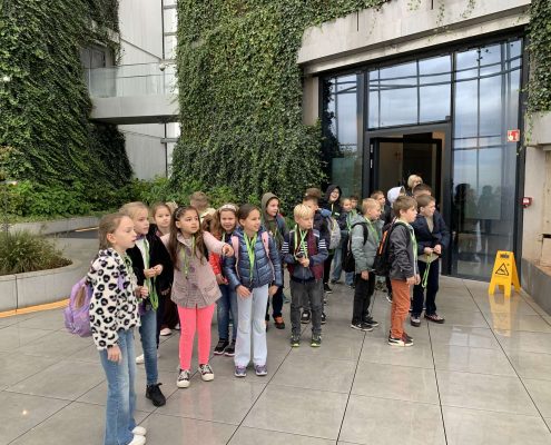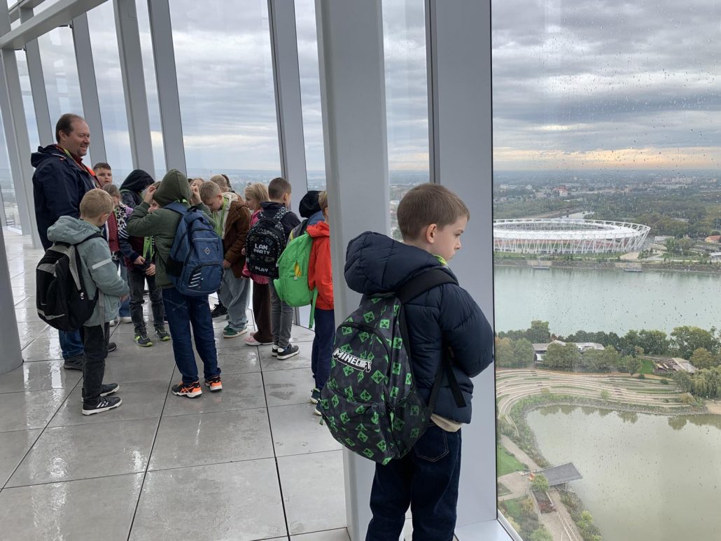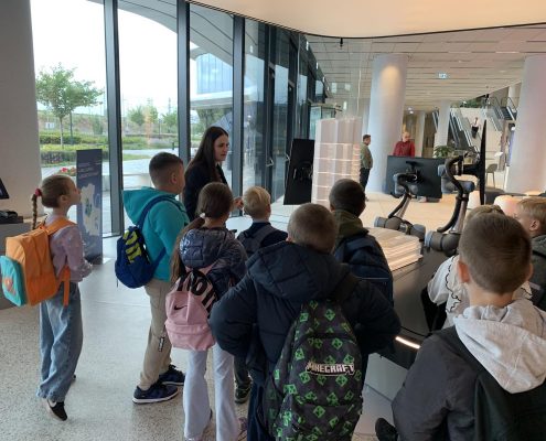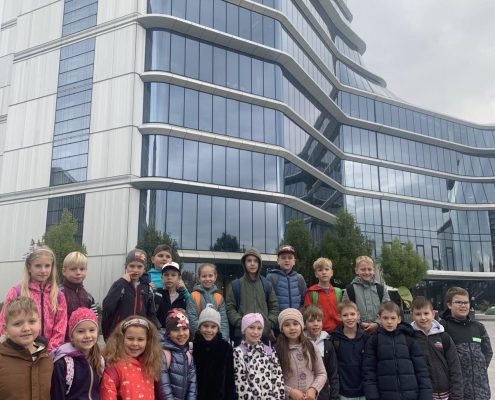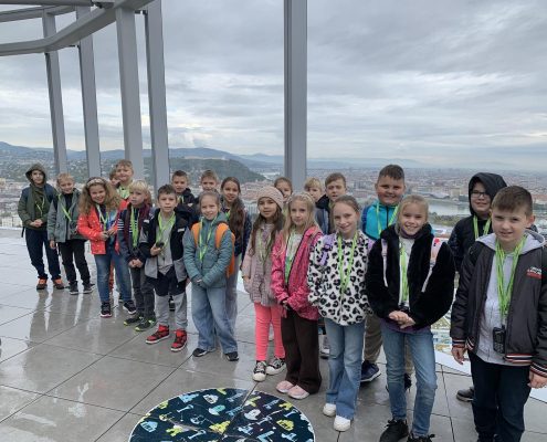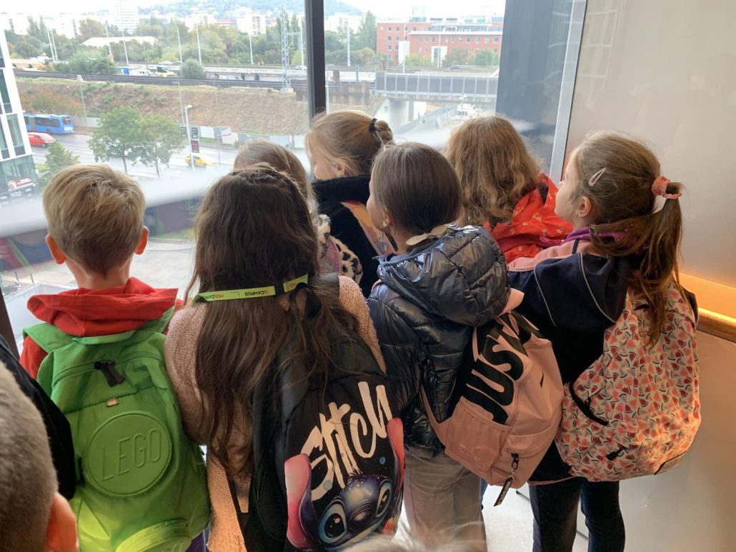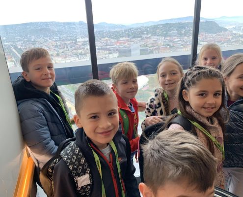 Egy kedves szülő segítségével szervezhettük meg ezt a különleges kirándulásunkat a Kopaszi- gáthoz, a Mol Campusba. Már az épület mérete is lenyűgöző: Magyarország legmagasabb irodaháza, 143 méter magas, és több mint 28 emeletből áll. 23 lift üzemel az épületben, melyek közül néhány rendkívül gyorsan, másodpercenként akár 5 métert is képes megtenni, így Magyarország leggyorsabb liftjeinek számítanak. Megtudtuk, hogy az épületet úgy tervezték, hogy környezetbarát és energiatakarékos legyen – például esővizet is hasznosítanak benne, és rengeteg zöld növény díszíti belülről.