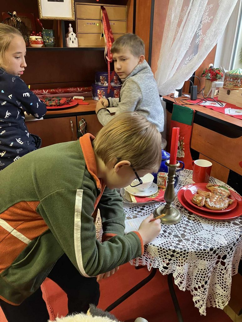 A szobában minden a Télapó „rendelkezésére” áll. Kényelmes ágy, karosszék, meleg zokni, fogmosó pohár, fogkefe, írógép, játékok, meleg tea és