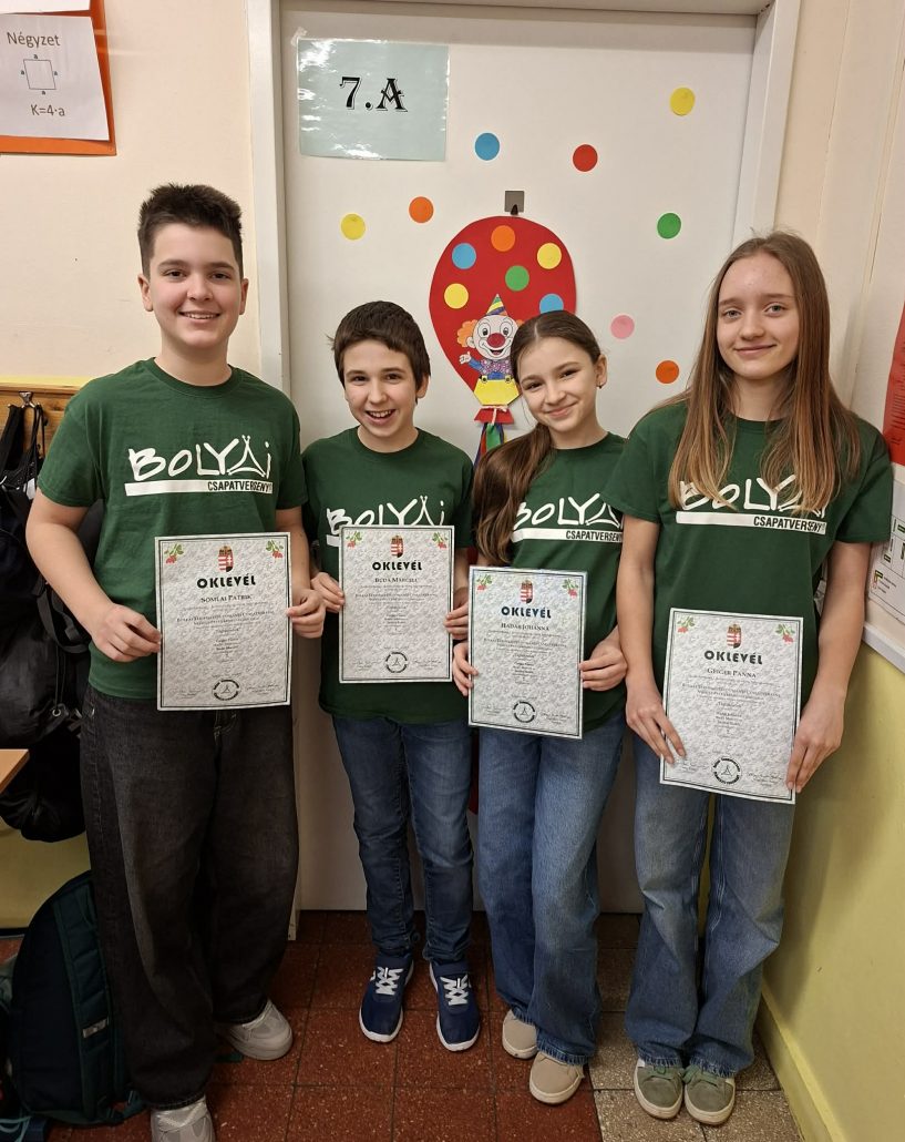 A 7. évfolyamról a Tágtűrésűek: Geiger Panna, Hadar Johanna, Buda Marcell, Somlai Patrik (7.a) 2. helyezést, mellyel mindkét csapat bejutott az országos írásbeli döntőre.