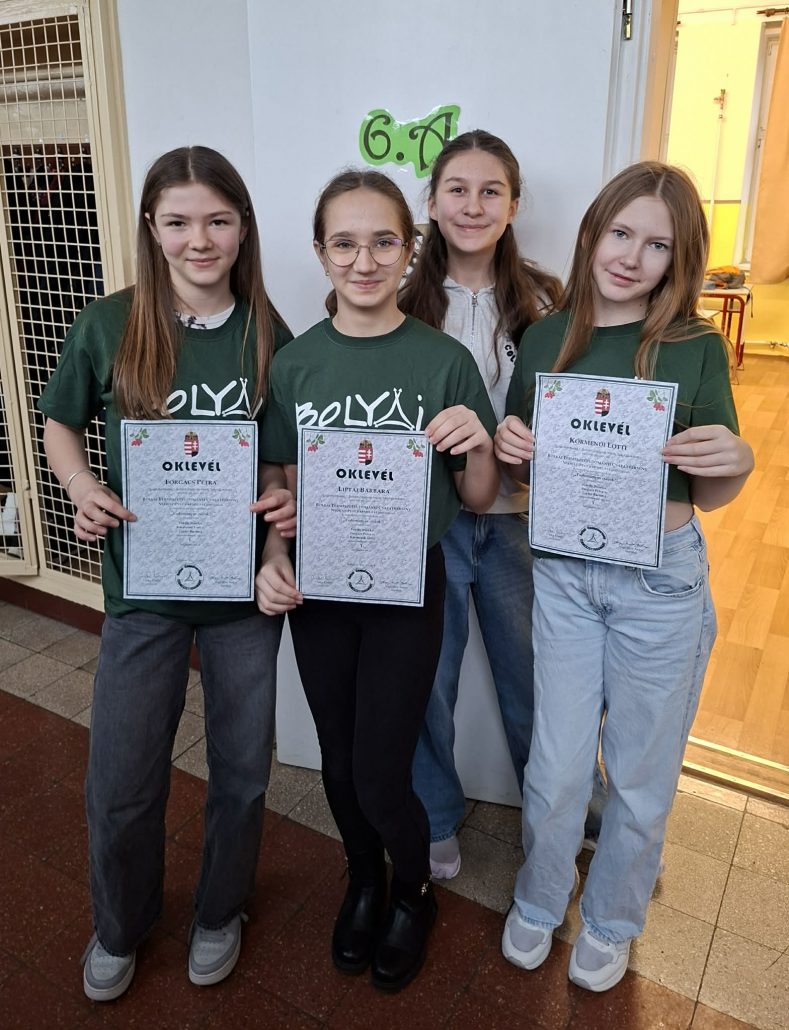 A 6. évfolyamról a Tudományos csajok: Fekete Boróka, Forgács Petra, Körmendi Lotti, Liptai Barbara (6.a) 1. helyezést értek el.